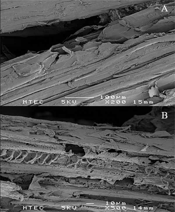 如圖3所示,將通過(guò)分離獲得的固相微結(jié)構(gòu)通過(guò)SEM與天然RH進(jìn)行了比較;钚蕴吭牧咸峁┝苏G彝暾谋砻妫砻髦参锊牧系母叨扔行虻耐暾Y(jié)構(gòu)(圖3A)。分離的固體殘余物的生物質(zhì)的表面結(jié)構(gòu)顯示出表面和內(nèi)部結(jié)構(gòu)的破壞,并具有空腔和裂紋。該觀察結(jié)果表明半纖維素的去除和表面木質(zhì)素的改變。對(duì)于BET表面積測(cè)量,分析了原始和預(yù)處理的生物量樣品。