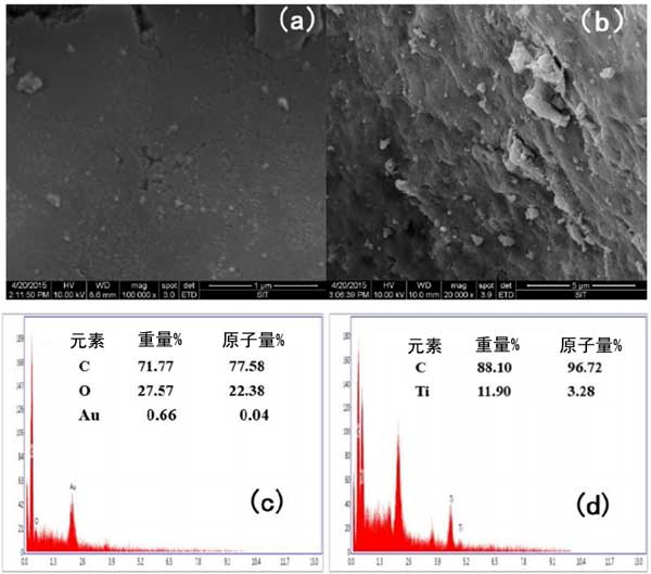 圖1:活性炭(a、c)和二氧化鈦載活性炭(b、d)的SEM圖像和EDX分析。