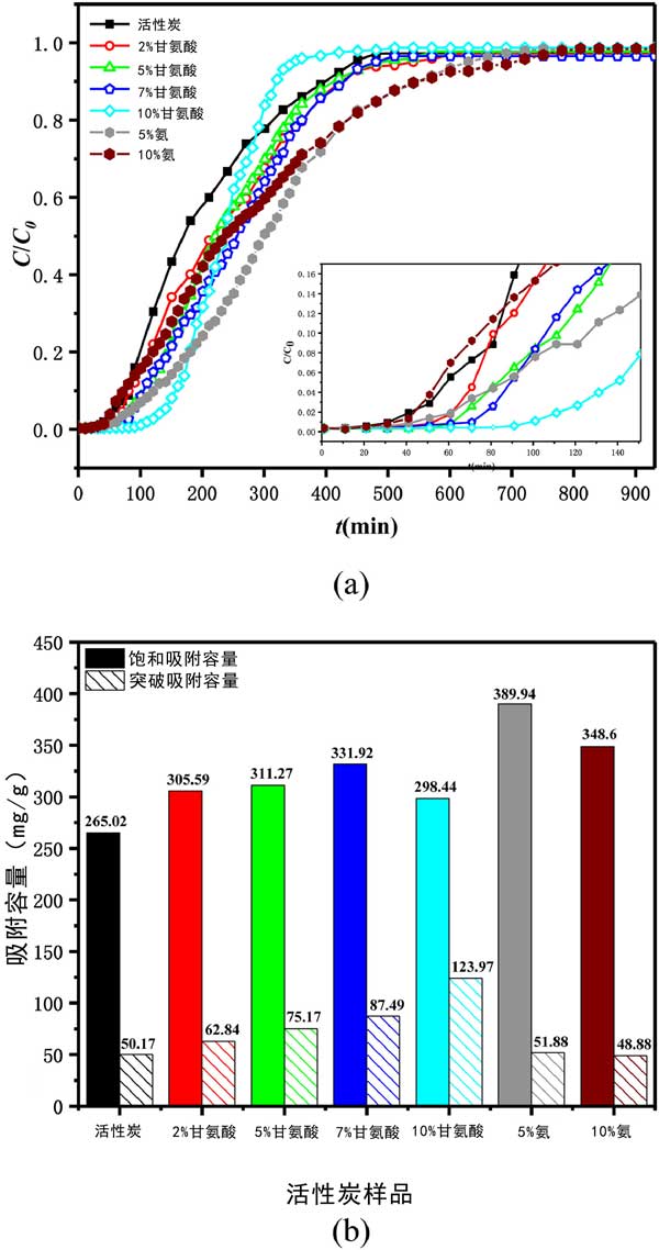 測(cè)試了選定的甲苯VOC對(duì)活性炭的吸附性能。在每個(gè)實(shí)驗(yàn)運(yùn)行中,甲苯通過(guò)裝有活性炭的吸附管直到達(dá)到平衡,即活性炭吸附劑被甲苯飽和。圖2(a)所示的穿透曲線呈現(xiàn)為甲苯吸附量吸附(ç/ç0)與接觸時(shí)間(噸,分鐘)六種的活性炭正在進(jìn)行中,它們的飽和和突破吸附容量如圖2所示(b)。從吸附曲線可以看出,甘氨酸修飾的活性炭的穿透時(shí)間明顯延長(zhǎng),而飽和氨改性活性炭的時(shí)間延長(zhǎng);钚蕴可霞妆酱┩肝侥芰Φ捻樞?yàn)?0%甘氨酸改性活性炭>7%>5%>2%>5%氨改性活性炭>未改性活性炭>10%氨改性活性炭,而活性炭對(duì)甲苯飽和吸附容量的順序如下:5%氨改性>10%>7%甘氨酸改性>5%>2%>10%>未改性活性炭。可見(jiàn)甘氨酸修飾對(duì)甲苯吸附有顯著的正向影響。與原來(lái)的AC相比,甘氨酸改性的活性炭對(duì)甲苯的突破吸附能力分別提高了25%、50%、74%和147%,隨著甘氨酸濃度的增加呈上升趨勢(shì)。同時(shí),甘氨酸改性的活性炭對(duì)甲苯的飽和吸附容量分別增加了15%、17%、25%和13%,且隨著甘氨酸濃度的增加先增加后減少。5%和10%的氨改性也提高了甲苯的吸附性能,但其優(yōu)勢(shì)主要體現(xiàn)在飽和吸附容量上,與原來(lái)的活性炭相比,分別提高了47%和32%。