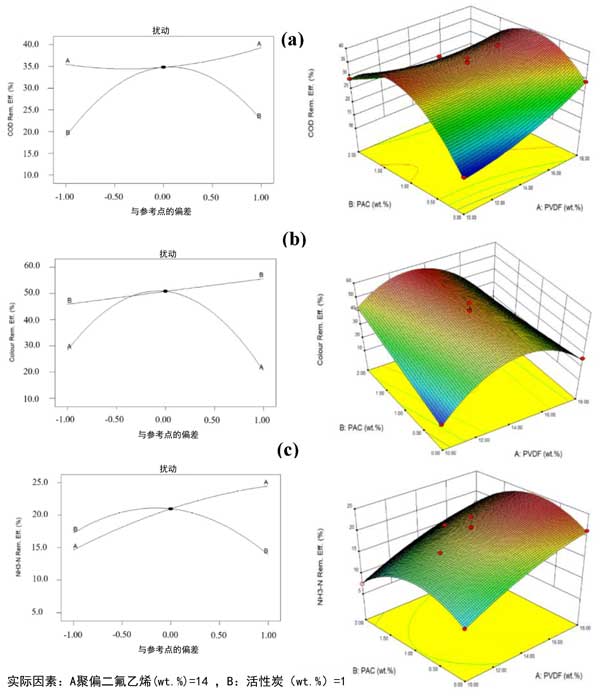 圖3:活性炭與聚偏二氟乙烯制造的膜的擾動圖(左)和3D響應(yīng)面(右)用于去除(a)COD、(b)顏色和(c)NH3-N的效率。