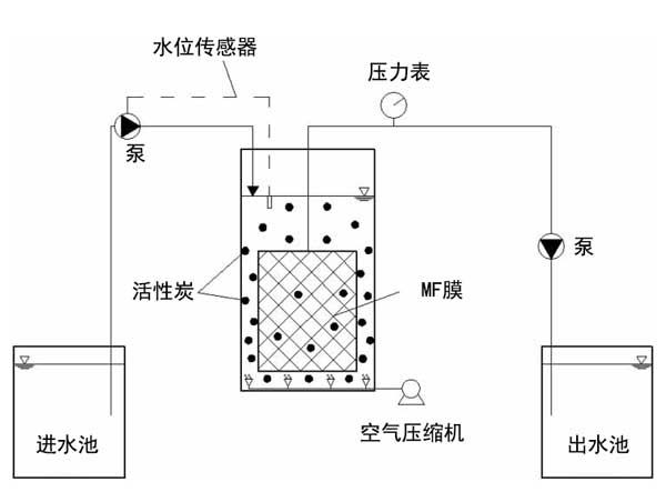 圖1:實(shí)驗(yàn)室規(guī)模的浸沒(méi)式膜過(guò)濾系統(tǒng)示意圖。