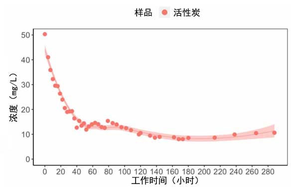 圖2:運(yùn)行期間主體相中動(dòng)力活性炭濃度的變化。