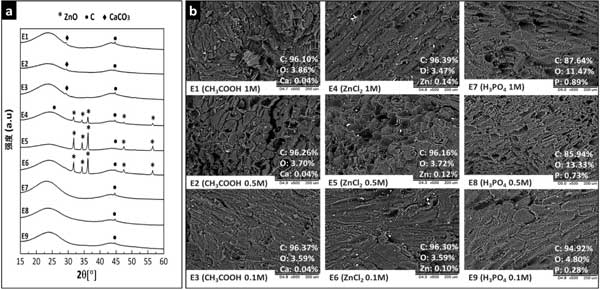 活性炭的X射線衍射圖如圖1-a所示。峰值在2θ=44在所有衍射圖中觀察到的6°歸因于對(duì)應(yīng)于石墨(00-001-0646)的(101)平面。與其他材料不同,活性炭的衍射圖也顯示在2θ=26.4°歸因于石墨(00-001-0646)的(002)平面。ZnO和CaCO3可能是在熱處理過(guò)程中作為原材料組分和活化劑之間二次化學(xué)反應(yīng)的產(chǎn)物或由于前體中固有的殘留礦物質(zhì)含量而產(chǎn)生的。經(jīng)過(guò)掃描電鏡分析500倍的SEM顯微照片如圖1-b所示。觀察到所有活性炭都表現(xiàn)出異質(zhì)表面形態(tài),其由不規(guī)則形式的成組薄片組成。在用ZnCl2活化的碳的表面上觀察到與氧化鋅相對(duì)應(yīng)的沒有特定形狀的白色小顆粒(通過(guò)XRPD分析證實(shí))。此外,EDS分析顯示存在分散在整個(gè)表面的碳(C)、氧(O)和鋅(Zn),從而證實(shí)了ZnO顆粒分散在這些吸附劑的表面上。