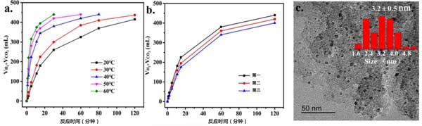 圖3:(a)在不同反應(yīng)溫度下由活性炭載鈀催化的總體積(H2+CO2)生成和(b)甲酸分解的穩(wěn)定性測試。(c)回收的活性炭催化劑TEM顯微照片和粒度分布。