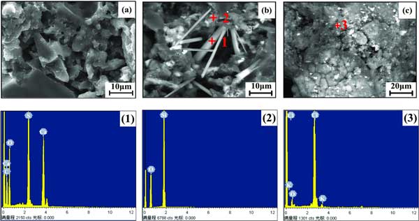 圖2:活性炭和危廢活性炭的SEM圖像和EDS結(jié)果。(a)危廢活性炭圖像;(b,c)活性炭圖像(1)CaSO4;(2)的SiO2;(3)KCl。