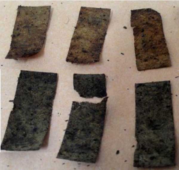 在觀察結束時,與不含納米活性炭的紙張相比,含納米活性炭的紙張降解更徹底,物理結構更脆。大約50%的活性炭紙被完全降解,同時在土壤試塊生物降解試驗中只有1個纖維素紙被完全降解。觀察12周后的紙張外觀如圖2所示。但是,紙張的降解能力也受紙張類型的影響。以往對各類紙張的生物降解性的研究結果表明,不同類型的紙張在受控條件下具有不同的生物降解性。研究發(fā)現,除非改變制造工藝,否則報紙和紙巾/紙手帕更難生物降解。