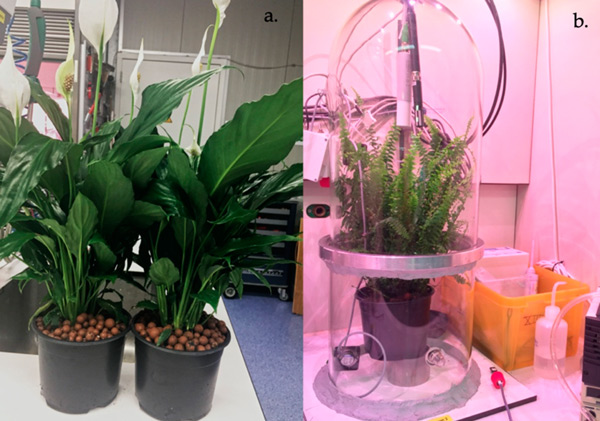為測(cè)試選擇了三種不同的介質(zhì):活性炭和膨脹粘土、土壤。選定的植物盆栽土壤由泥炭、綠色堆肥、石灰和肥料組成;牡倪x擇基于之前的研究,因?yàn)樗鼈兪鞘袌?chǎng)上常見的基材。對(duì)于每種類型的基材,進(jìn)行了六項(xiàng)測(cè)試:三項(xiàng)使用干基材,三項(xiàng)使用濕基材。將基板分別放入塑料容器中,即基板的暴露區(qū)域。測(cè)試了兩種不同的植物(圖1)。每種植物選擇3株進(jìn)行試驗(yàn),并選擇具有相似年齡和大小特征的植物。