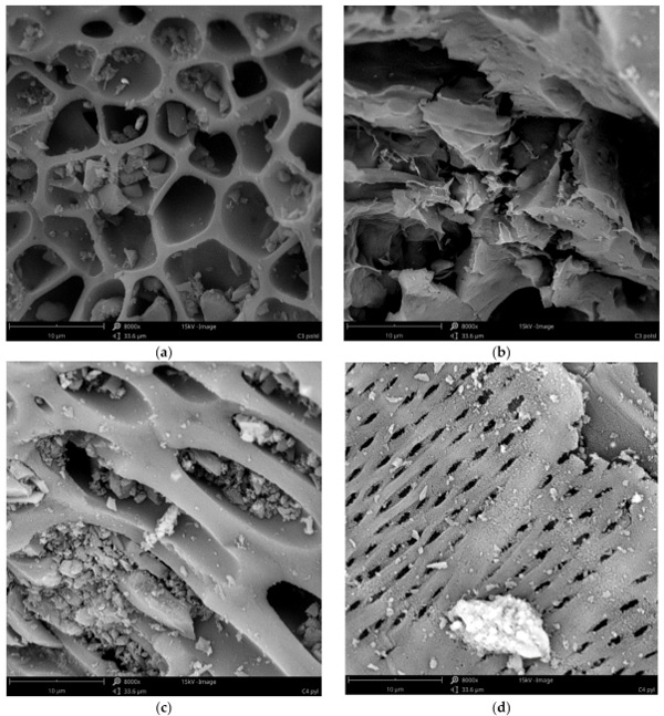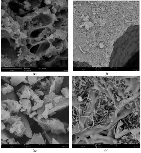 在溶劑加載之前的活性炭通過(guò)使用掃描電子顯微鏡作為SEM顯微照片進(jìn)行表征(圖1)。分析表明,不僅研究不同材質(zhì)活性炭彼此的不同,而且在一種材料中也可能出現(xiàn)不同的結(jié)構(gòu)(圖1a與圖1b、圖1c與圖1d、圖1e與圖1f和圖1g與圖1h)。所有的材料都不是均質(zhì)的,在所有的原材料中,都可以發(fā)現(xiàn)具有不同孔隙率的顆粒、壓實(shí)的塊狀,甚至是纖維結(jié)構(gòu)。材料C1(粒徑0.5÷0.75mm的活性炭)是高度多孔的,顆粒充滿可見(jiàn)孔,直徑為5÷11µm,壁光滑(圖1a),顆粒結(jié)構(gòu)的壁密度較低,但也有很大的表面積(圖1b)。粉狀活性炭(C2)具有較小的(圖1d)和較大的(圖1c)孔,具有光滑(圖1c)和較粗糙(圖1d)的壁和細(xì)長(zhǎng)的形狀。這兩種材料似乎都具有良好的孔隙率和表面,因此它們應(yīng)該是非常有效的吸附劑。我們的結(jié)果證實(shí),C1和C2在鉭的去除方面都非常有效,去除效率約為97%。C3的多孔性要小得多。雖然有一些顆粒具有相對(duì)較高的孔隙(圖1e),但也有較高含量的更致密、相當(dāng)無(wú)孔的塊狀(圖1f)?紫督Y(jié)構(gòu)受到輕微干擾,可能是由植物材料中可能存在的無(wú)機(jī)化合物晶體造成的(圖1e)。因此,這種結(jié)構(gòu)表明較低的表面和吸附特性。然而,無(wú)孔件的表面積似乎很發(fā)達(dá)(圖1f)。這是相當(dāng)虛幻的,因?yàn)樵谑褂玫乃谢钚蕴恐,材料C3的鉭去除效率最低(81%)。最小的大孔材料似乎是C4炭。它由具有緊湊結(jié)構(gòu)的塊(圖1g)和類似于納米管或纖維結(jié)構(gòu)的形式(圖1h)組成。這種材料的多孔性也比C1和C2少,但由于纖維的原因,它的表面應(yīng)該比C3更發(fā)達(dá),因此它應(yīng)該具有更好的吸附效率。事實(shí)上,這種材料的鉭去除效率略高于C3,但仍低于活性炭C1和C2。根據(jù)這些結(jié)果,可以得出結(jié)論,C1和C2的原材料就具有大孔結(jié)構(gòu)。