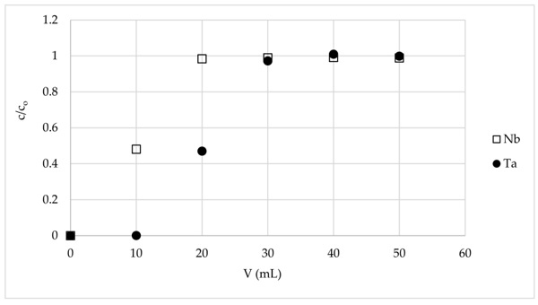 圖2:鈮和鉭在含活性炭的固定床柱上的穿透曲線。