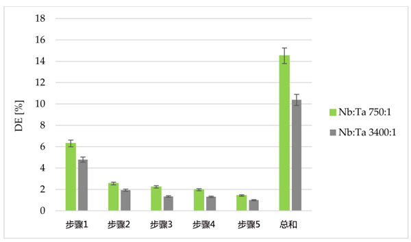 在進(jìn)一步的研究中,檢查了是否可以多次使用相同部分的浸漬活性炭從鉭中提純鈮。為此,以分批模式進(jìn)行解吸研究。使用了兩種不同的剝離劑草酸銨和過(guò)氧化氫的溶液(圖3),它們與鉭離子形成穩(wěn)定的絡(luò)合物。解吸過(guò)程分五個(gè)步驟進(jìn)行,在使用4%草酸銨溶液而不是15%過(guò)氧化氫溶液的情況下,解吸效率明顯更高。使用第一汽提劑,可以回收保留在活性炭上約50%的鉭。大部分鉭在第一步和第二步中回收,因此在第五步停止解吸,認(rèn)識(shí)到繼續(xù)該過(guò)程不會(huì)顯著提高所獲得的解吸百分比。解吸效率還受吸附過(guò)程中活性炭上保留的鉭量的影響。在批量吸附過(guò)程中保留在樹(shù)脂上的鉭量的差異是由于使用了具有不同鈮與鉭比率的溶液,同時(shí)保持溶液中Nb和Ta離子的可比總濃度。降低活性炭(Nb:Ta=3400:1)上的鉭量會(huì)導(dǎo)致解吸效率顯著降低,這可能是由于活性炭結(jié)合了一些鉭離子。