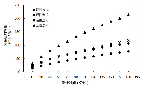 活性炭是去除有機(jī)物的常用吸附劑。吸附性能主要取決于其比表面積和微孔結(jié)構(gòu)。它們具有較高的內(nèi)部孔隙率,因此具有較高的吸附性。在本研究中,對四種具有不同表面性質(zhì)的顆;钚蕴繕悠(活性炭-1、2、3和4)進(jìn)行了去除黃藥的測試。將兩克活性炭樣品與50毫升1590毫克/升的黃藥溶液混合15分鐘。過濾活性炭,并用紫外-可見光譜法測量溶液中的殘余黃藥。通過重復(fù)使用碳樣品,重復(fù)該程序12次,以達(dá)到大吸附量。如圖1所示,活性炭-4的吸附容量比較高,因此選擇其進(jìn)行進(jìn)一步研究。
