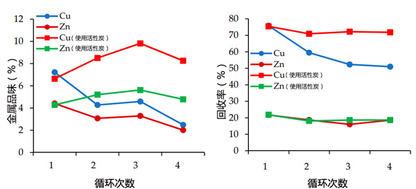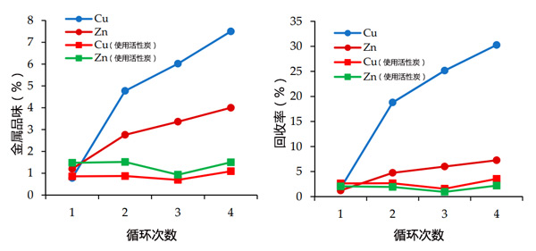 圖4:使用活性炭和不使用活性炭進(jìn)行水處理時(shí),Cu和Zn的品位和對粗銅精礦的回收率。