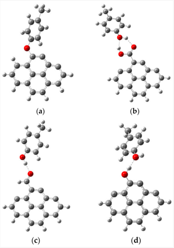預(yù)計甲酚在活性炭上的吸附將通過各種類型的相互作用進行,例如電子供體-受體機制、靜電相互作用、π-π相互作用和氫鍵形成。然而,在各種類型的相互作用中,活性炭和被吸附物之間的氫鍵是有助于吸附過程的重要相互作用類型之一。因此,在本研究中,使用DFT方法研究了對甲酚和活性炭之間的氫鍵相互作用?紤]到它們之間的氫鍵,研究了對甲酚與原始活性炭和功能化活性炭的相互作用。圖1代表各種相互作用的優(yōu)化結(jié)構(gòu)。