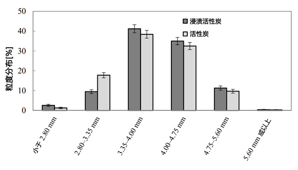 在一系列實驗中使用了用碘酸和無機酸浸漬的顆粒活性炭。根據(jù)測量粒度分布、堆積密度和甲苯吸附能力,和測量浸漬活性炭的pH值。粒度按篩子大小分類。通過測量包裝在200mL容器中的浸漬活性炭的重量來計算堆積密度。通過將1/10甲苯蒸氣流到10g浸漬活性炭中,測量甲苯蒸氣吸附前后的重量差,計算出甲苯吸附容量。將3g浸漬活性炭加入300mL離子交換水中并搖動30分鐘,制成活性炭樣品再進行pH測量。圖1顯示了浸漬活性炭和活性炭的粒度分布。對于浸漬活性炭和活性炭,粒徑均為2.80-5.60毫米。這些粒徑通常是氣體處理的值。通過浸漬,堆積密度增加,甲苯吸附能力降低。這可能是由于浸漬材料滲入了孔隙。由于金屬的雜質(zhì),活性炭的pH值呈堿性。由于酸解離,通過浸漬降低了pH值。