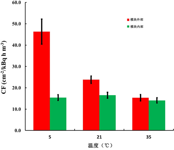 對(duì)于實(shí)驗(yàn),使用三種活性炭的織物為探測(cè)器設(shè)計(jì)了單獨(dú)的模塊。對(duì)于前兩種活性炭,模塊是HDPE,對(duì)于第三種活性炭,模塊是LDPE。單獨(dú)設(shè)計(jì)遵循上述方法,考慮到每種活性炭織物的確切單獨(dú)質(zhì)量。在所有設(shè)計(jì)中,不同溫度下的k(T)值根據(jù)方程式計(jì)算;钚蕴康慕Y(jié)果如圖2所示。5℃時(shí)的CF0比35℃時(shí)的CF0高305%。相比之下,對(duì)于放置在補(bǔ)償模塊中的傳感器,CF的變化在17%以內(nèi)(最大值/最小值=1.17)。值得注意的是,在模塊內(nèi)部不同溫度下暴露的傳感器的CF之間的配差異在95%的顯著性水平上沒有統(tǒng)計(jì)學(xué)意義。發(fā)現(xiàn)所描述的帶有補(bǔ)償模塊的探測(cè)器的CF明顯高于其他常用的無源氡探測(cè)器。