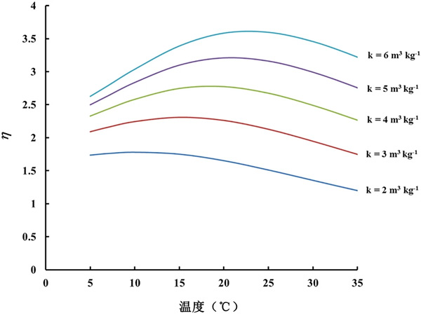 查看活性炭的檢測(cè)器的結(jié)果(圖2)可以看出,相同溫度下的CF0在活性炭之間存在差異。這意味著不同活性炭的吸附能力存在一些差異。在所有模塊設(shè)計(jì)中,假設(shè)21℃下的吸附容量值為4m3/kg-1。然而,由于我們的實(shí)驗(yàn)結(jié)果表明不同活性炭材料的k可能存在差異。不同k值的結(jié)果如圖3所示?梢钥闯,對(duì)于區(qū)間2-6m3/kg-1內(nèi)的所有k值,η的變化(例如最大/最小比率)與溫度的變化遠(yuǎn)小于未包裝傳感器觀察到的230-305%的變化。