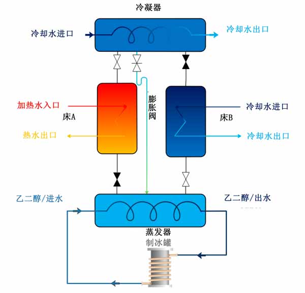 吸附制冰系統(tǒng)的兩床配置來檢查使用50%活性炭、10%聚乙烯醇和40%石墨烯納米片的復合吸附劑。制冰可以通過循環(huán)乙二醇來完成,乙二醇在-2℃下進入吸附制冷的蒸發(fā)器,并帶有外部制冰塊,如圖1所示。復合活性炭吸附劑應用于吸附床中普通銅管的外表面上,加熱和冷卻流體被泵入管內(nèi)。加熱和冷卻水在四個過程(預熱、解吸、預冷和吸附)之間在兩個床之間切換,完成一個床循環(huán)。根據(jù)操作模式,切換閥用于將蒸發(fā)器和冷凝器與吸附床連接起來。