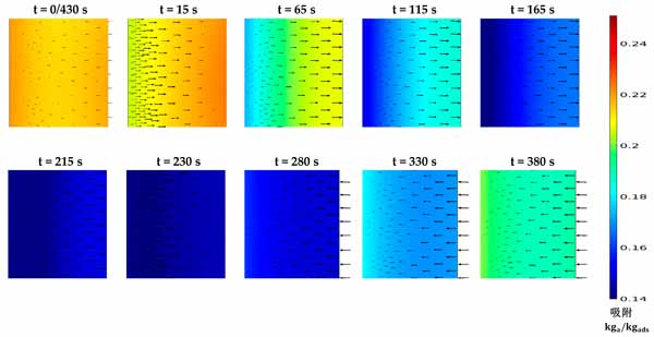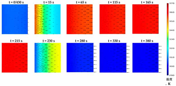 活性炭復合吸附劑的壓力和溫度決定了平衡吸收,它代表了在給定時間分別在吸附和解吸階段可以達到的最大和最小吸收容量。然而,顆粒內(nèi)和顆粒間的傳質阻力表明吸附材料在每種給定情況下可以多快達到其平衡吸收能力。這突出了在本研究中同時求解兩種傳質機制與其他控制方程的重要性,以顯示促進傳熱對傳質的凈效應。圖2顯示了在430秒循環(huán)時間內(nèi),考慮到預熱和預冷階段均為30秒的時間間隔內(nèi)代表性部分的固結吸附劑域的溫度分布。
