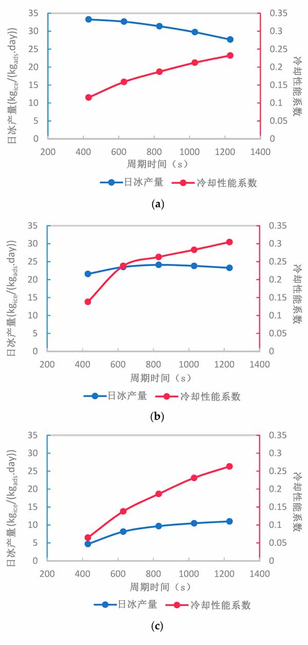 在活性炭厚度為2、5和10mm時,循環(huán)時間的變化對制冰系統(tǒng)的每日制冰量和冷卻性能系數(shù)的凈影響如圖4所示?傮w而言,在給定范圍內(nèi)增加循環(huán)時間可以增加或減少系統(tǒng)的每日制冰量,具體取決于活性炭復合材料的厚度。然而,無論活性炭復合材料的厚度如何,系統(tǒng)的冷卻性能系數(shù)通過增加循環(huán)時間而增加。盡管如此,系統(tǒng)冷卻性能系數(shù)在1230的較長循環(huán)時間和5mm活性炭復合材料厚度下達到其最大值。通過增加活性炭復合材料的厚度,日冰產(chǎn)量在不同循環(huán)時間內(nèi)的變化范圍顯著減小,這可以通過比較圖4a-c中給出的每日制冰量范圍看出。這歸因于活性炭復合材料厚度較厚時有效吸收的減少。