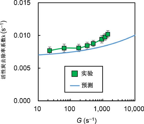 我們研究了混合強度對去除率系數(shù)(k)的影響(圖1)。我們繪制了實驗數(shù)據(jù),實線顯示了方程式預測的值。實驗結果和預測結果都表明,去除率系數(shù)隨著混合強度的增加而增加,但在G>1000s-1的范圍內(nèi),實驗結果的增加率變得更陡峭,偏離預測的速率系數(shù)值。我們假設偏差背后的急劇增加是由于活性炭顆粒在高混合強度下的分解(在給炭時輕度聚集)。這些預測是在假設活性炭顆粒的尺寸(部分聚集在原料懸浮液中)在給炭后保持不變的情況下做出的,因為原位顆粒尺寸測量是不可能的。如果這個假設是正確的,那么去除率系數(shù)隨著混合強度的急劇增加,在高G對于在給炭時已經(jīng)處于分散狀態(tài)的活性炭顆粒,不應觀察到-值范圍。為了驗證這一假設,我們使用了非聚集活性炭,其粒徑在分散處理前后沒有變化,我們在不同的混合強度。我們沒有觀察到隨著活性炭混合強度的增加,去除率系數(shù)的急劇增加,強烈表明觀察到的活性炭的急劇增加是由于高混合條件下的顆粒分解。