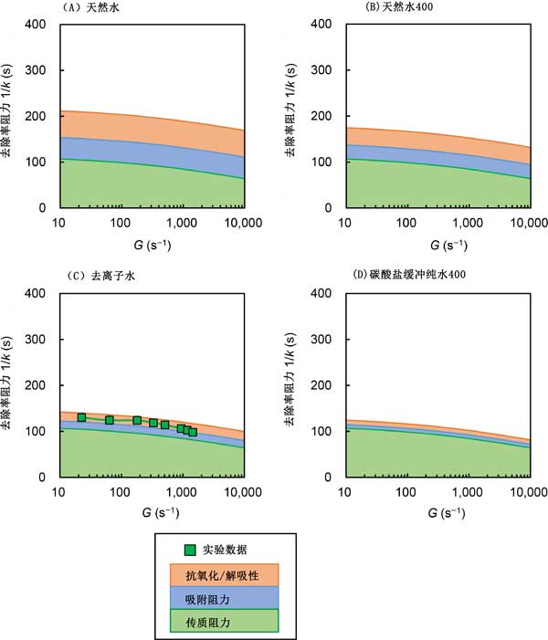 圖2:去除率阻力(1/k)分解成其成分(即,外膜傳質(zhì)、吸附和氧化/解吸的速率阻力)與活性炭混合強度(G)的關系。