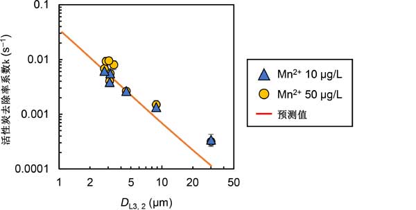 我們將Mn2+去除率系數(shù)(k)與活性炭的粒徑進行了比較(圖3)。我們使用源自相同活性炭的九種尺寸的碳顆粒繪制了實驗數(shù)據(jù),以便與方程式的預測進行比較。實驗值和預測值幾乎一致,并且在雙對數(shù)圖上都顯示出線性關系。仔細觀察發(fā)現(xiàn),預測值的斜率比實驗值更陡,在較大顆粒范圍內(nèi),實驗值略大于預測值。這可能是由于顆粒形狀或表面性質(zhì)的任何差異:我們假設了一系列參數(shù)值,包括球形值,這些預測與顆粒大小無關,但在實際的活性炭中,這些值可能隨顆粒大小而變化?傮w而言,活性炭的粒徑對Mn2+去除性能有很大影響。
