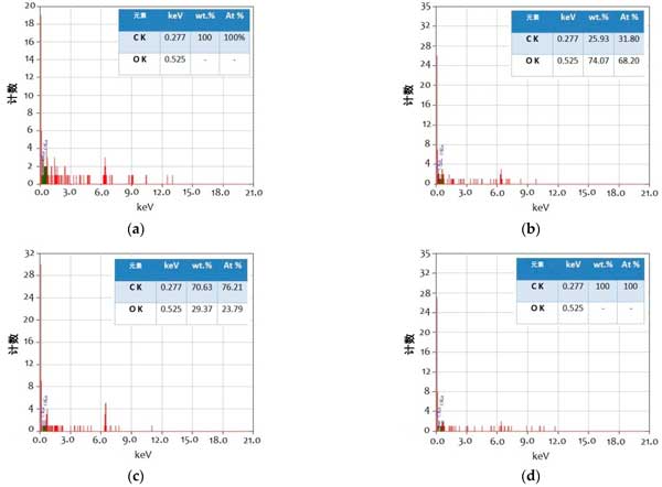 圖4:測試樣品在500倍放大率下的SEM磨痕圖像的EDX光譜(a)鋰基潤滑脂,(b)1wt.%活性炭,(c)2wt.%其他樣品,和(d)0.5wt.%活性炭+2wt.%其他樣品。
