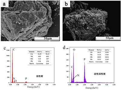 圖1:活性炭(a)和改性活性炭(b)的表面形態(tài)和活性炭(c)和改性活性炭(d)的EDAX光譜。