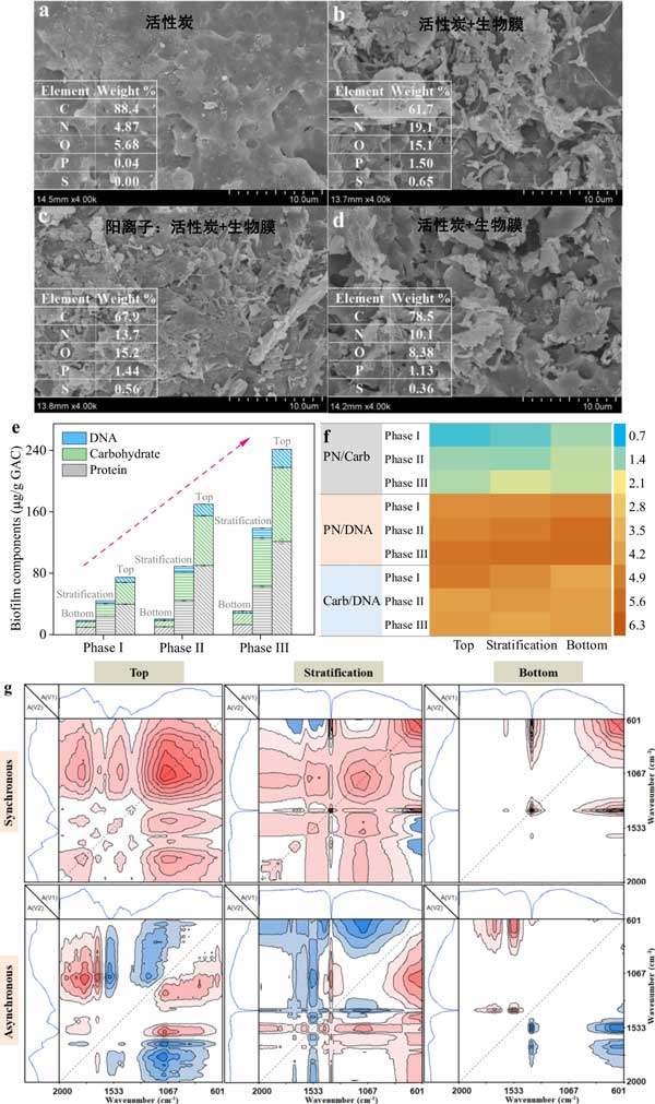 活性炭是生物膜生長的優(yōu)良載體,它可以快速從液相中吸收有機物和營養(yǎng)物質(zhì),用于生物膜中微生物的新陳代謝。圖1顯示了有和沒有生物膜的活性炭形態(tài)動力學(xué)、生物膜組分的濃度和反應(yīng)器不同位置的官能團;钚蕴恐械脑刂饕ㄌ(C,88.4%)、氮(N,4.87%)、氧(O,5.68%),以及少量的磷(P,0.04%),活性炭表面為比較順利。生物膜形成后,活性炭表面附著大量生物質(zhì),變得更加粗糙。由于生物膜中蛋白質(zhì)、碳水化合物和DNA的積累,包括N、O和P在內(nèi)的主要元素的比例顯著增加(圖1e)。值得注意的是,硫元素也被檢測到,這應(yīng)該有助于活性炭和生物膜對LAS(磺酸基團)的吸附。