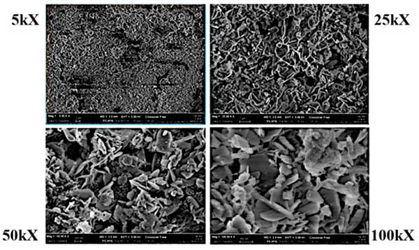 采用掃描電子顯微鏡(SEM)結(jié)合EDS分析來(lái)表征吸附劑樣品。局部化學(xué)分析通過(guò)EDS(能量色散X射線光譜法)實(shí)現(xiàn)。定性分析是通過(guò)識(shí)別光譜中報(bào)告的線來(lái)實(shí)現(xiàn)的,而定量分析(確定元素組成百分比)是通過(guò)測(cè)量樣品中存在的每種元素的線強(qiáng)度來(lái)進(jìn)行的。圖1顯示了一系列活性炭的SEM圖像,放大倍數(shù)遞增:5000、25,000、50,000、100,000倍。SEM圖像說(shuō)明了活性炭的多孔結(jié)構(gòu),突出了樣品表面不連續(xù)性的存在。高孔隙率的存在對(duì)于限制鼓風(fēng)機(jī)系統(tǒng)過(guò)濾沼氣的能量損失是必要的。正如我們之前的一些研究報(bào)道的那樣,SEM圖像與EDS分析相結(jié)合可用于突出硫在孔隙和金屬基催化位點(diǎn)內(nèi)的吸附和保留。