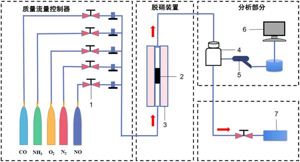 圖2:氣體反應(yīng)裝置示意圖(1)轉(zhuǎn)子流量計(jì),(2)催化劑,(3)固定床反應(yīng)器,(4)緩沖氣瓶,(5)探測槍,(6)煙氣分析儀,(7)廢氣回收裝置。