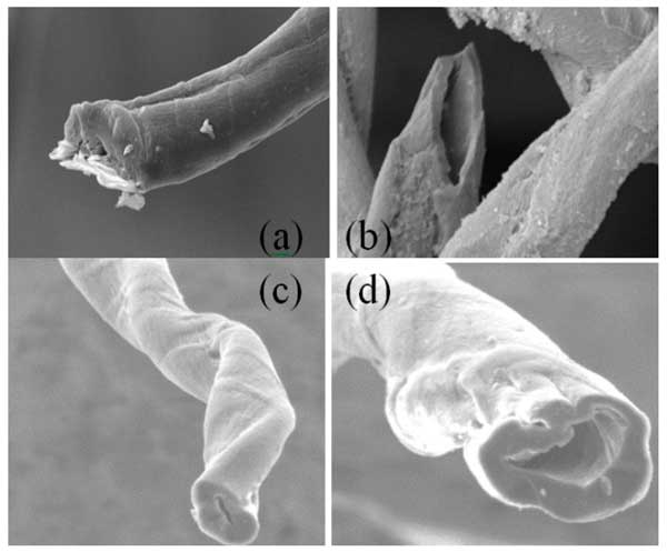 通過煅燒和HNO3、H2O2和KOH活化,廢棉纖維成功轉(zhuǎn)化為不同結(jié)構(gòu)的活性炭。圖1顯示了三種活性炭的SEM圖像?梢钥闯,化學(xué)活化有助于大孔隙的形成。在整個纖維長度上可以觀察到一個空心芯,直徑約為0.5–5.0µM,形狀幾乎為圓形。活性炭具有高度多孔的結(jié)構(gòu),核心直徑在大約0.5和5μM之間(圖1b,d)。這種大孔隙率可能與纖維內(nèi)壁木質(zhì)素的化學(xué)破壞有關(guān)。參考活性炭(圖1a)呈現(xiàn)大孔隙,而形態(tài)特征是纖維中芯的出現(xiàn),其直徑取決于活化劑。使用過氧化氫作為活化試劑獲得最大直徑(圖1b)。如圖1b-d所示,前體的結(jié)構(gòu)(最初具有干凈的表面)在每次化學(xué)處理后都會被破壞。有趣的是,其中一種活性炭的表面在化學(xué)活化的影響下發(fā)生明顯變化(與其他活性炭相比)。