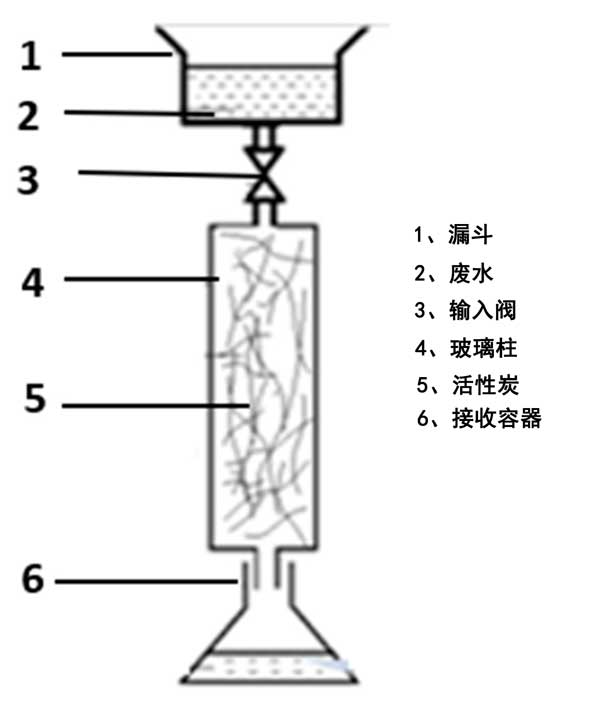 通過在密封玻璃瓶中將已知量(4.0g)的活性炭與50mL實際廢水樣品進行反應(yīng),進行批量吸附平衡實驗。測試了具有不同初始硫濃度(100、300、500、800和1000mg·L-1)的五個樣品。將瓶子在恒溫搖床上放置24小時,直至達到平衡(最終pH值:10.5)。用于床吸附實驗的裝置的示意圖如圖2所示。將碳化纖維填充到玻璃柱中以研究它們的吸附能力。廢水被引入漏斗并通過輸入閥以將流量調(diào)節(jié)為4–5.10m3·h-1。首先,使用流經(jīng)柱的蒸餾水潤濕床吸附裝置以改善活性炭纖維的潤濕特性。其次,允許漏斗中的煉油廠廢水樣品內(nèi)容物通過活性炭床通過重力排放到接收容器。每小時回收處理過的水。