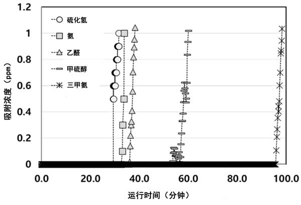 為了評估活性炭對不同廢氣的有效吸附量,應(yīng)研究其吸附能力。廢氣的氣味閾值和刺激水平在十億分之一的水平。吸附劑的總吸附容量很難用作從廢物中去除廢氣的設(shè)備的設(shè)計(jì)因素。因此,我們根據(jù)突破點(diǎn)計(jì)算了小于1ppm的有效吸附量。突破柱實(shí)驗(yàn)在304不銹鋼管式反應(yīng)器中進(jìn)行,總流量為1L/min,其中包含硫化氫(H2S)、氨(NH3)、乙醛(AA)、甲硫醇(MM)和三甲胺(TMA),如圖2所示。突破曲線依次為H2S、NH3、AA、MM、TMA。與廢氣相比,TMA具有更好的動態(tài)吸附性能,因?yàn)樗哂懈L的突破時間和相應(yīng)的更大的有效吸附容量(<1ppm)。