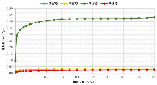 活性炭的吸附等溫線已使用氮(N2)吸附分析技術(shù)(一種標(biāo)準(zhǔn)方法)進(jìn)行了研究。圖2顯示了活性炭在77K時(shí)的N2吸附等溫線,該等溫線被發(fā)現(xiàn)為I型等溫線。N2吸附在低相對(duì)壓力范圍內(nèi)的快速上升證實(shí)了所有樣品都存在小孢子,如圖2所示。很明顯,活性炭4具有最低的N2吸附,而活性炭1和活性炭2的吸附等溫線重疊,活性炭3具有最高的N2吸附。數(shù)據(jù)的這種可變性可能歸因于所使用的不同前體材料。此外,除活性炭3外,活性炭的大部分孔隙體積都填充在P/Po≈0.1以下。對(duì)于活性炭3,孔體積填充低于P/Po≈0.3。在初始增加到0.1后,等溫線逐漸彎曲,表明進(jìn)一步吸附的增量較小。隨著相對(duì)壓力的增加,所有樣品的吸附幾乎呈水平狀態(tài),表明已經(jīng)達(dá)到飽和。