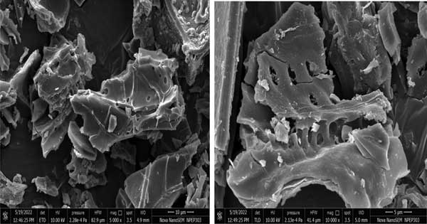 使用掃描電子顯微鏡分析獲得的活性炭的孔結(jié)構(gòu)。SEM設備具有超高分辨率低電壓成像和獨特的低真空能力。SEM圖像是在15kV時以1nm、1kV時1.4nm、3kV時1.8nm和30Pa的不同分辨率拍攝的。觀察活性炭的表面物理形態(tài)是通過使用SEM完成的技術。圖3顯示活性炭的SEM圖像。這表明活性炭的外表面具有均勻開放的大孔。此外,活性炭的表面是高度多孔的,其特點是不均勻。同樣清楚的是,活性炭在其外表面具有微孔和空腔,暗區(qū)位于該處。經(jīng)受碳化后,活性炭由于ZnCl2的蒸發(fā)而產(chǎn)生空隙(稱為氣孔)。可以將這些孔視為通向微孔網(wǎng)絡的通道。