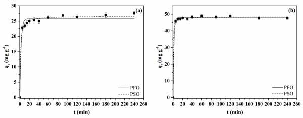 研究了初始吸附物濃度為50mgL-1和pH4的兩種活性炭的亮藍(lán)染料染料吸附動(dòng)力學(xué)行為。作為時(shí)間函數(shù)的吸附容量曲線分別如圖3a、b所示,分別為活性炭1和2?梢杂^察到活性炭2獲得的曲線的特征在于更快的吸附速率;钚蕴2在大約10分鐘內(nèi)達(dá)到平衡。對(duì)于活性炭1,在大約60分鐘內(nèi)達(dá)到平衡。由于活性炭1呈現(xiàn)的較高總孔體積,可以解釋這種行為。高孔體積可以通過允許染料分子在孔內(nèi)更快地?cái)U(kuò)散到吸附位點(diǎn)來增強(qiáng)吸附動(dòng)力學(xué)。