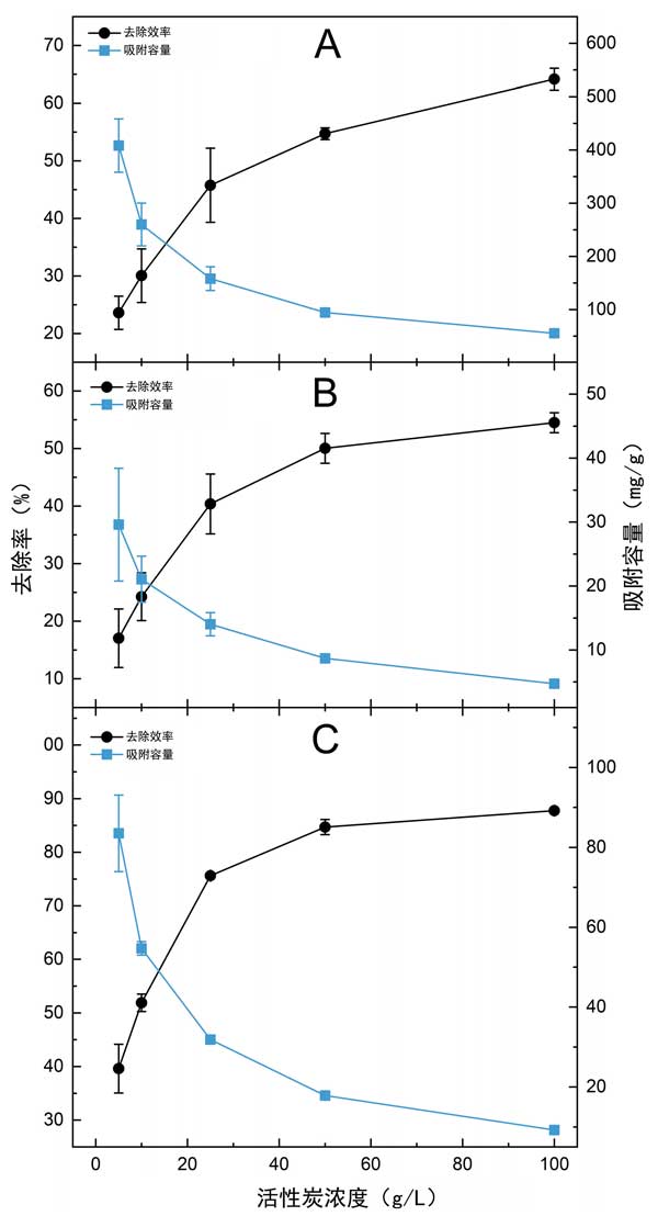 圖1:用幾種濃度的活性炭處理農(nóng)用工業(yè)沼渣時,計(jì)算的COD(A)、PO4-P(B)和總酚(C)參數(shù)的吸附容量和去除效率。
