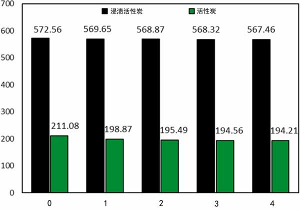 為了研究吸附劑吸收汽油蒸汽的性能,我們進(jìn)一步評(píng)估了樣品在吸附-解吸循環(huán)中的可重復(fù)使用性。在恒溫下,1小時(shí)后,當(dāng)吸附劑達(dá)到飽和狀態(tài)時(shí),浸漬再生過(guò)程。四個(gè)吸附循環(huán)后,蒸汽吸附容量為567mg/g,所用吸附劑保持大量吸收分子。HMTA-AC-D樣品表明蒸汽吸收略有減少約0.89%,而活性炭樣品的這一量為7.9%(圖3)。在高循環(huán)下,由于孔隙的逐漸破壞和不完全脫氣,吸收量可能會(huì)顯著降低。根據(jù)我們的發(fā)現(xiàn),與文獻(xiàn)相比,制成的吸附劑在物理和熱學(xué)上表現(xiàn)出更高的穩(wěn)定性。這些結(jié)果表明,樣品在回收汽油蒸汽時(shí)具有很高的可持續(xù)性,可以作為一種有效的吸附劑提出并考慮。