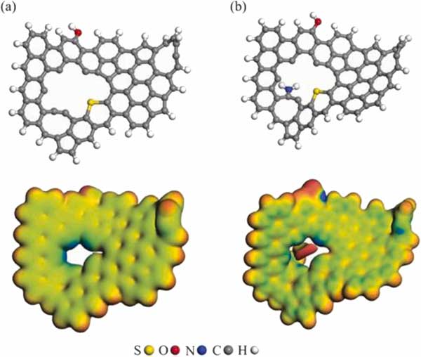 圖4:(a)活性炭和(b)浸漬活性炭吸附劑的優(yōu)化幾何結(jié)構(gòu)(上圖)和相應(yīng)的MEP等值面。