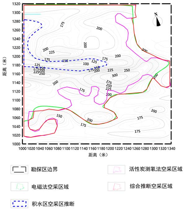 本次調(diào)查工作將電磁法與活性炭測氡法相結(jié)合,形成綜合物探方法,對某礦區(qū)地下采空區(qū)情況進行了研究。首先,電磁法用于探測采空區(qū)的深度探測。發(fā)現(xiàn)1個低阻異常帶和1個高阻異常帶,推測后者為采空區(qū)異常帶,前者由采空區(qū)積水或大鵬地層水富集形成,推測為采空區(qū)積水異常帶。然后使用用于測氡的活性炭方法來推斷地下采空區(qū)的位置和范圍。結(jié)合電磁法勘探成果,推測該采空區(qū)為氡值異常帶。