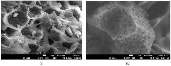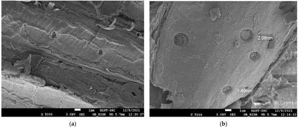 使用FESEM分析觀察了活性炭產品的浸漬和碳化溫度影響的形態(tài)變化。圖1a、b描繪了木質素在被激活之前的表面形態(tài)。它顯示出厚而平坦的圖案,中間有小裂縫。這歸因于大量的木質素,一種酚類聚合物,賦予植物結構強度,使其具有堅硬粗糙的木材狀結構。在圖1b中,發(fā)現前體具有壓實的表面,上面有淺而堵塞的孔隙圖案。這可能是由于烘箱干燥過程中預處理和加熱過程的反應。從圖1a、b,由于無孔表面的存在,表面清楚地顯示為不令人滿意的吸附材料。