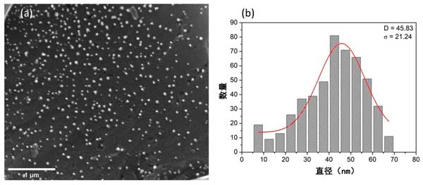 圖2:具有1微米比例尺的SEM圖像顯示納米粒子在活性炭上的均勻分布(a)以及通過(guò)對(duì)活性炭混合納米雜化材料的SEM直方圖進(jìn)行高斯擬合獲得的尺寸分布(b)。
