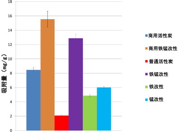 為了比較各種活性炭吸附砷(V)的效果,將0.1克活性炭添加到50mL/50ppm砷(V)樣品中。將樣品以150rpm攪拌6小時,然后過濾,然后對濾液進(jìn)行元素分析。為了比較不同活性炭基質(zhì)的功效,以每克活性炭吸附的砷(V)毫克數(shù)(mg/g)來比較相對于添加的活性炭量的吸附。如圖所示數(shù)字圖1,與鐵、錳和鐵/錳一起官能化后,砷的吸附有顯著改善。