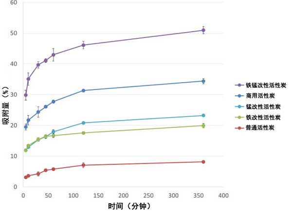復(fù)合鐵錳活性炭顯示出最高的吸附容量,6小時后的吸附量達(dá)到總吸附量的50.93±1.17%。這表明比標(biāo)準(zhǔn)活性炭和單金屬負(fù)載活性炭都有顯著改進(jìn)。鐵錳負(fù)載活性炭的二元系統(tǒng)協(xié)同工作,在吸附過程中利用了上述所有吸附機(jī)制,使得吸附容量比單金屬負(fù)載活性炭材料增加更多。