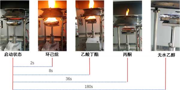圖3顯示了四個(gè)樣品的初始燃燒火焰和點(diǎn)火時(shí)間?梢钥闯觯膫(gè)樣本的點(diǎn)火時(shí)間按照環(huán)己烷<乙酸丁酯<丙酮<純無水乙醇的順序遞增。顯然,吸附VOCs后的樣品更易燃燒,其中環(huán)己烷樣品是最容易被點(diǎn)燃的一種。從火焰尺度來看,吸附樣品的火焰高度較大,燃燒強(qiáng)度較強(qiáng)。此外,純無水乙醇樣品的火焰顏色為淺藍(lán)色,表明純無水乙醇燃燒時(shí)樣品的表面溫度低于其他三個(gè)吸附樣品。