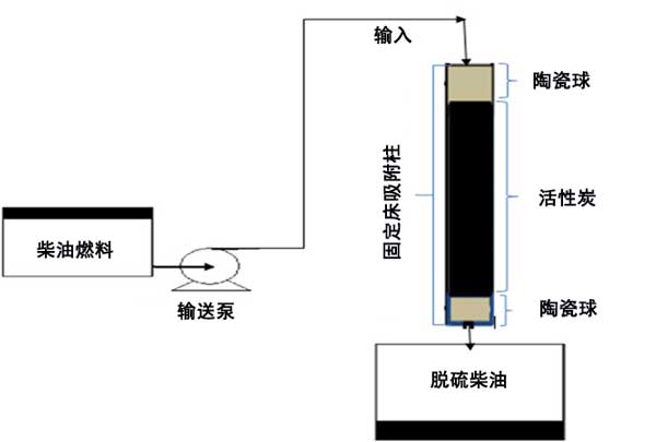 控制排放流量并且固定床吸附塔裝置中的流量保持恒定以達(dá)到穩(wěn)態(tài)條件。在接近穩(wěn)態(tài)條件時從固定床吸附塔裝置出口采集產(chǎn)品樣品并準(zhǔn)備用于硫含量分析。為了確認(rèn)脫硫?qū)嶒?yàn)結(jié)果的準(zhǔn)確性,每次運(yùn)行重復(fù)脫硫運(yùn)行兩次。運(yùn)行完成后關(guān)閉計量泵,并將所有打開的閥門設(shè)置為關(guān)閉。