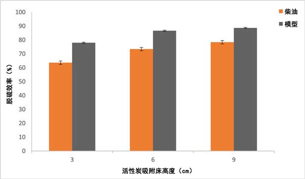 柴油和模型柴油用作油原料,以評估活性炭和改性活性炭的脫硫工藝。柴油初始硫濃度為7510ppm。兩種柴油原料用于固定床吸附塔裝置的脫硫工藝。為了進(jìn)行脫硫?qū)嶒?yàn),使用計量泵將油原料送入塔中。采用垂直向下固定床吸附塔裝置連續(xù)吸附硫化合物,流量為1mLs-1。柱子逐漸裝載不同高度的活性炭層(3-9厘米),對應(yīng)于不同的活性炭重量(10、7和4克)。