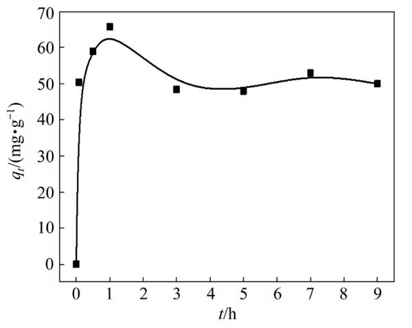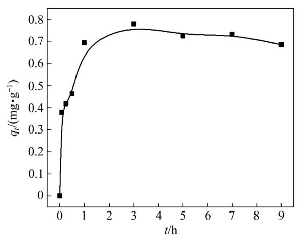 用100mL硫代硫酸銅溶液進(jìn)行銅吸附動力學(xué)試驗(yàn),初始銅濃度為3g/L。硫代硫酸鹽與銅的摩爾比為8:1。除另有說明外,0.5g活性炭用于吸附試驗(yàn)。圖2顯示了Cu(S2O3)23−在活性炭上的吸附動力學(xué);钚蕴繉︺~的吸附容量在前1h急劇增加,隨后略有下降并趨于穩(wěn)定。