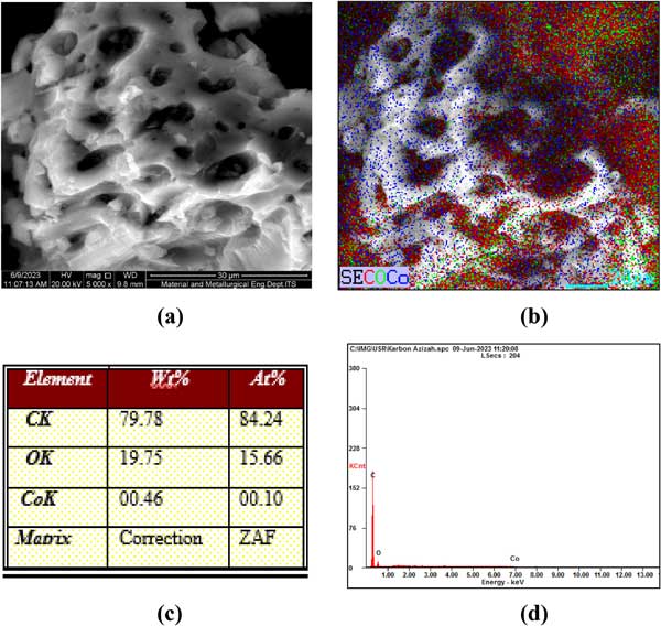 圖3:(a)活性炭的形態(tài)結(jié)構(gòu),(b)元素C、O和Co的分布圖,(c)樣品中元素組成值表,(d)樣品中元素組成值圖。